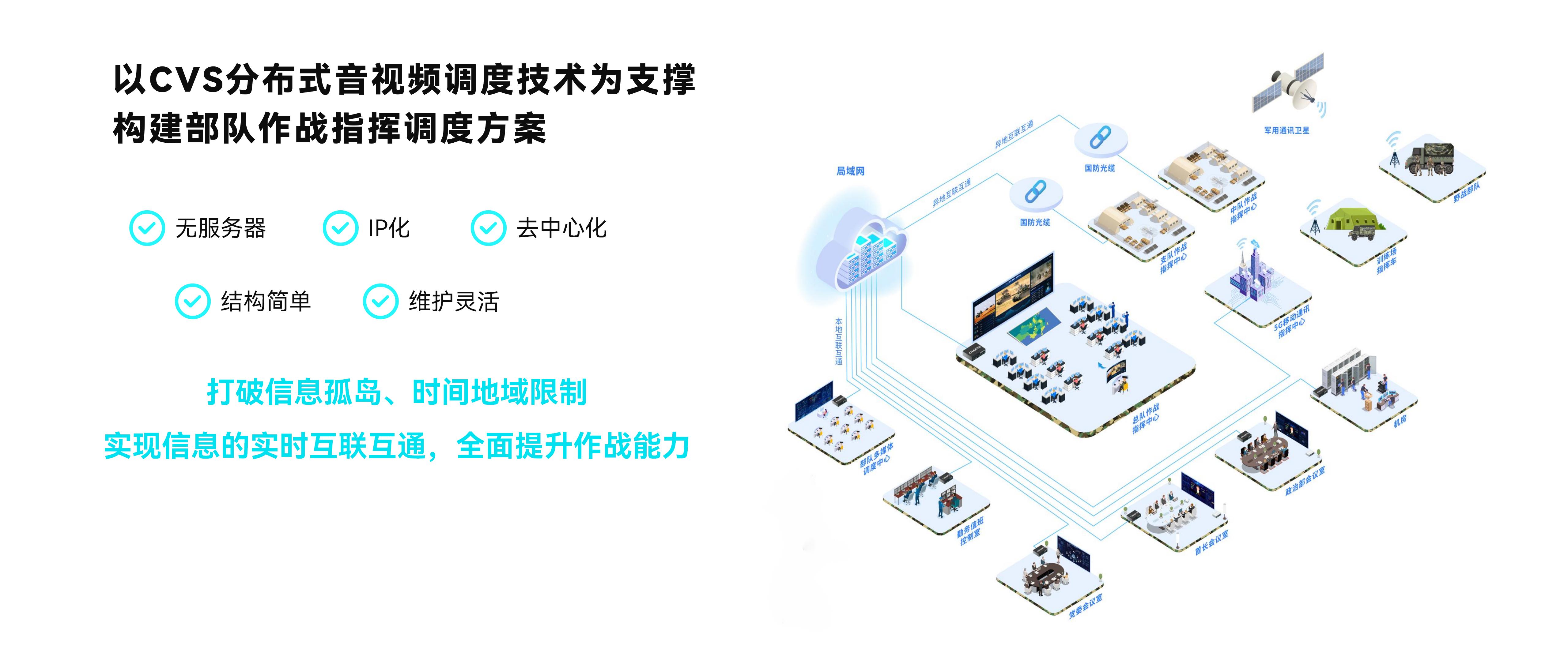 以长图CVS分布式音视频调度技术为支撑构建部队作战指挥调度方案,打破信息孤岛、时间地域限制,实现信息的实时互联互通,全面提升作战能力。